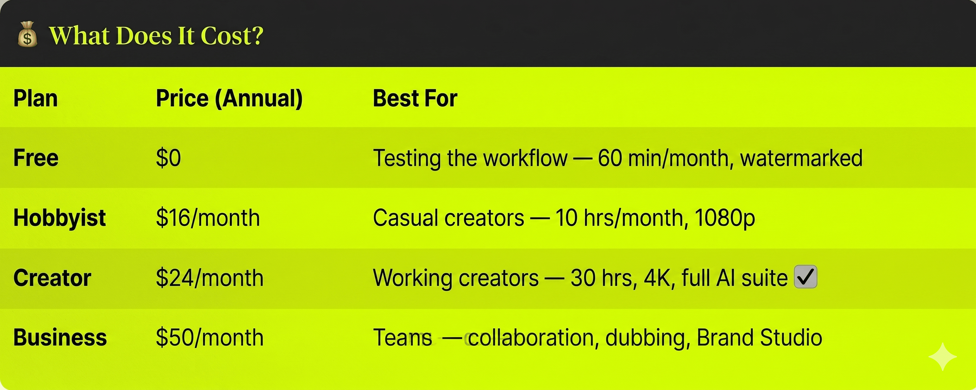 Sweet spot: The Creator plan at $24/month (annual) replaces what most creators are already spending across separate tools. Annual billing saves up to 35%.